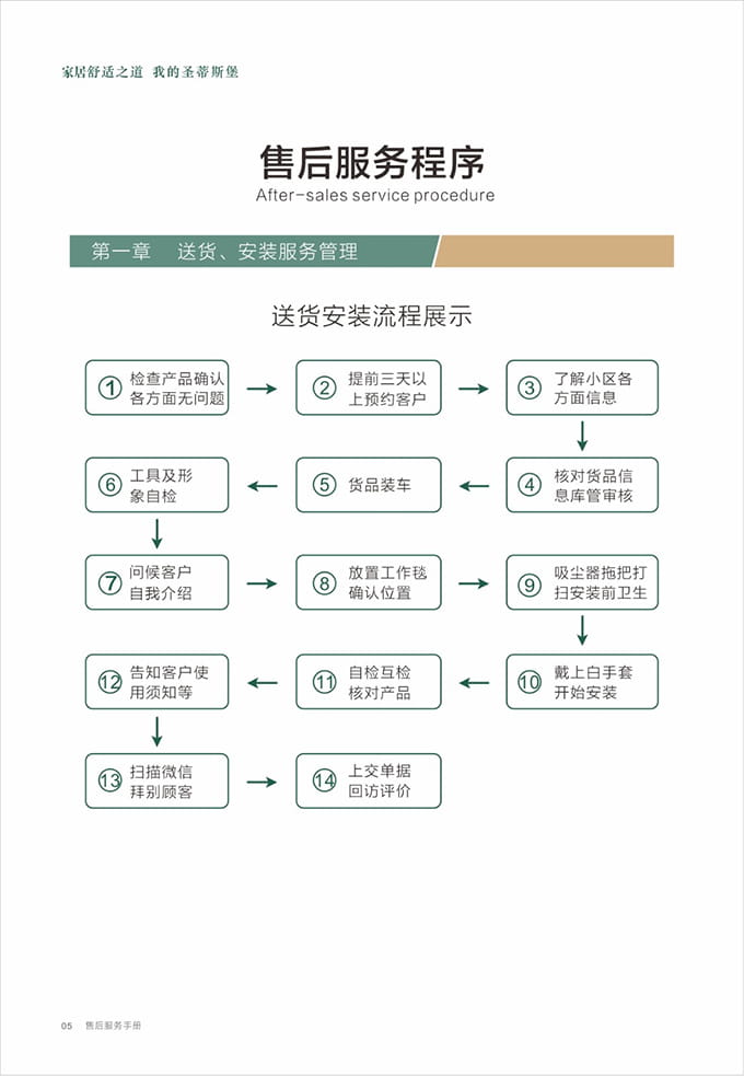 物资准备:上门前必须着圣蒂斯堡统一工作服,佩戴工作证,准备好安装工具、搬抬工具(搬运背带等)、备件、笔记本、手套、鞋套、地垫、卫生清扫工具(清洁剂、抹布、扫把簸箕、拖把、吸尘器等)、瓶装水、《圣蒂斯堡安装施工指示牌》、收据和圣蒂斯堡产品说明书、《产品配送单》和《配送满意度调查表》等物品。再带上小礼品,例:鲜花或碳包去味礼包等。