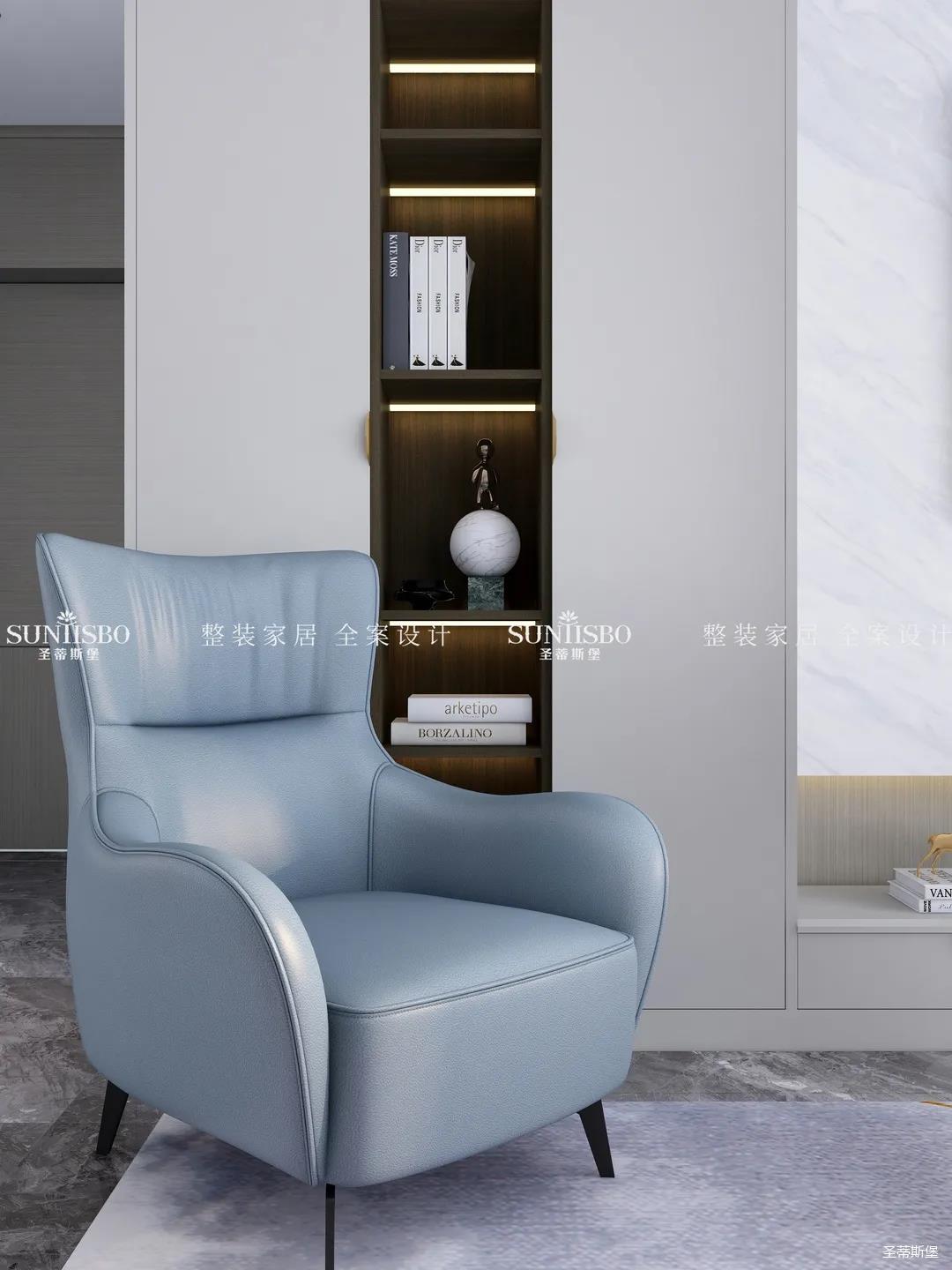 优雅浅灰L型定制柜与纹理清晰的大理石组合电视墙,满足了业主审美与实用的双向需求。一张淡蓝色的休闲椅,让业主能感受到亮丽明艳色彩之外的独特,低调不张扬,却在温润中传递出色彩的力量。通过纹理清晰的护墙为底,为柔和优雅的静态客厅增添了层次感十足的空间律动。