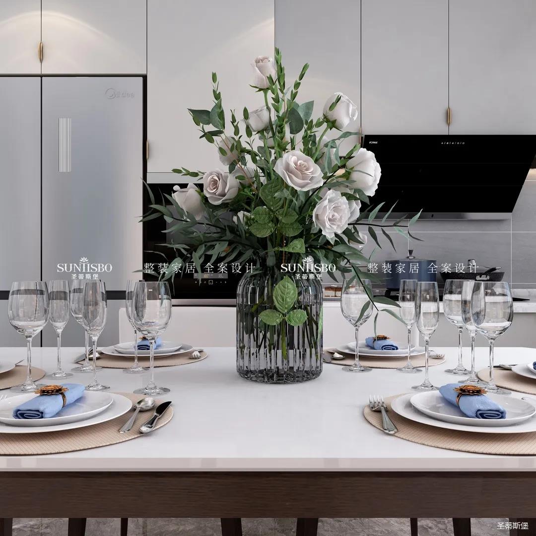 餐厅中大理石肌理的桌面自然袒露,自然亲肤的触感、皮革质感的现代餐椅坐感舒适自然。沉稳的实木材质延伸,精致的瓷白餐盘搭配金属质感的物件,通透的玻璃器皿点缀其中,契合了业主对品质生活的追求。