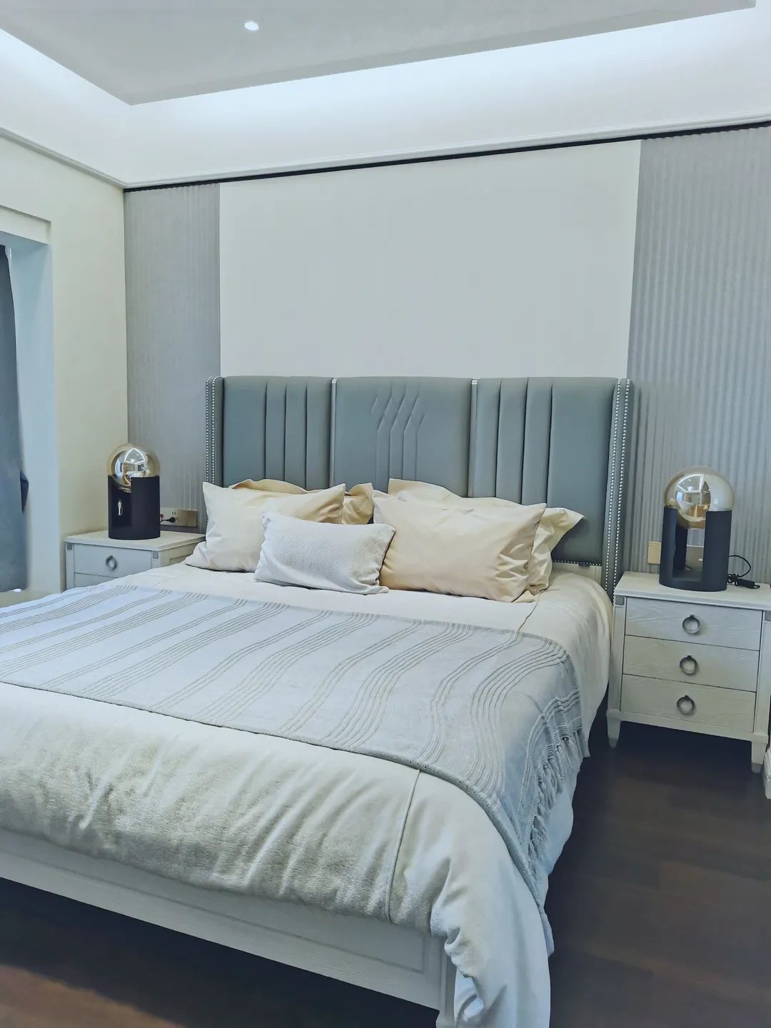 主卧睡眠空间与衣帽间相隔半扇透玻璃门,